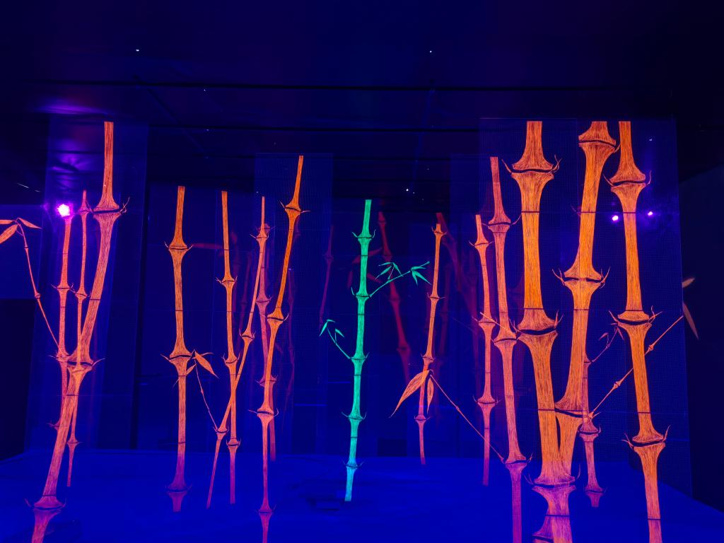 在成都国际非遗节现场,年轻艺术家刁娟带来了一件与众不同的作品——《赤色晚秋》。在全息投影技术的光影效果下,红色的蜀绣竹子生动醒目,营造出一派竹林悠悠的意境。这是刁娟与韩国艺术家一起合作的作品,展示了传统非遗与现代技术结合的发展新路径,让人眼前一亮。