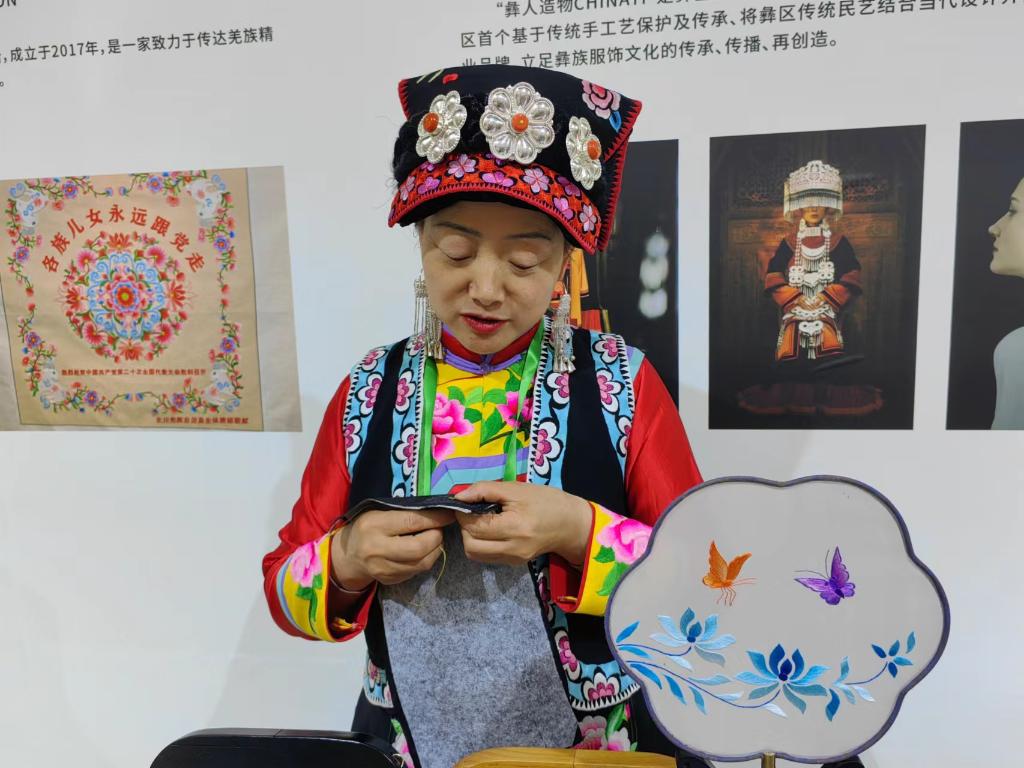 陈云珍在成都国际非遗节现场展示羌绣技艺。新华社记者 董小红 摄