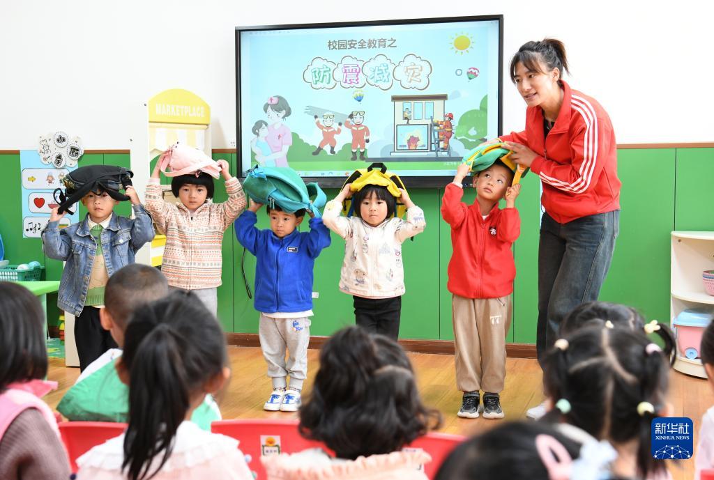 10月13日,云南省丽江师范高等专科学校附属新苗幼儿园的老师给孩子们讲解地震逃生和自救常识。