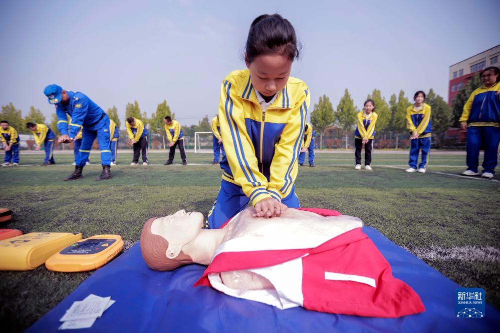 10月13日,蓝天救援队员在河北省遵化市第三中学辅导学生练习心肺复苏技能。