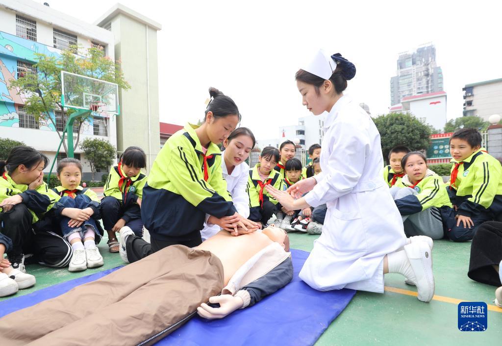 10月13日,在湖南省衡阳市蒸湘区实验小学,南华大学护理学院的志愿者指导小学生进行心肺复苏急救操作。