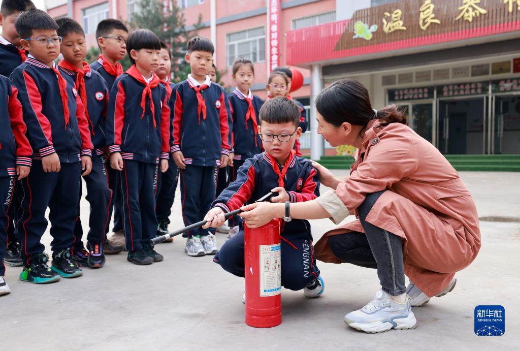 10月13日,河北省唐山市丰南区岔河小学的教师为学生讲解灭火器的使用方法。