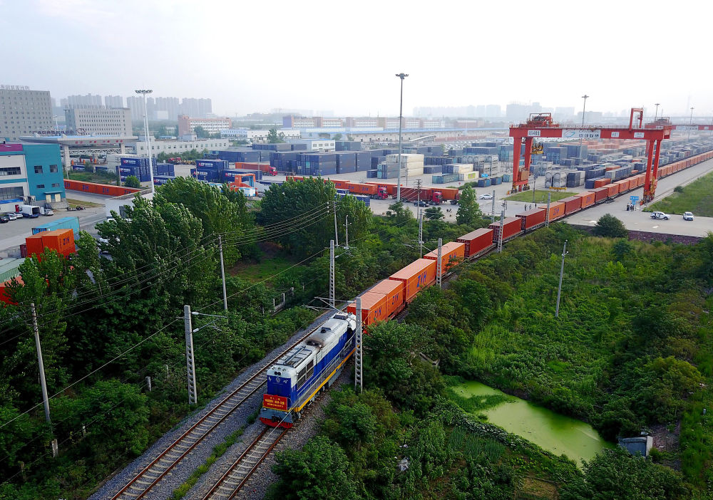 一列中欧班列(郑州)驶出郑州铁路集装箱中心站(2017年8月2日摄)。新华社记者 李安 摄