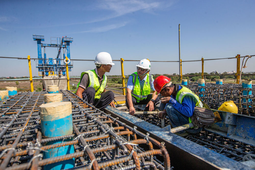 ↑中国建筑土木建设有限公司的工作人员在大城府的中泰铁路建设现场工作,