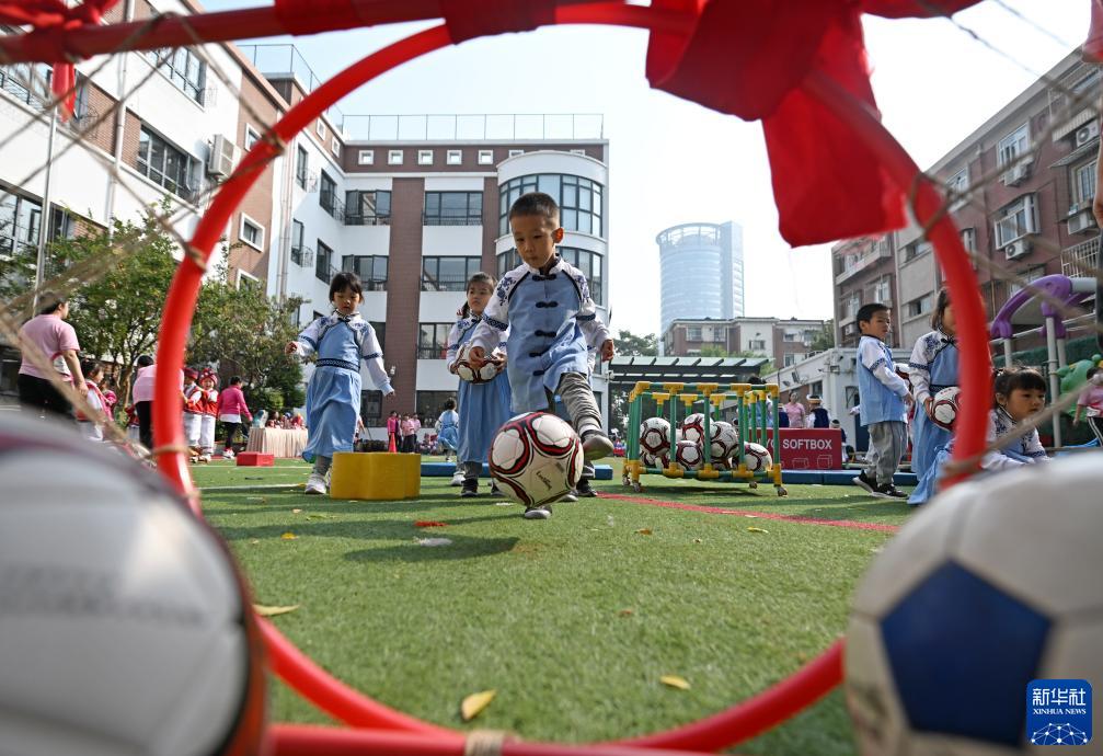 10月13日,天津市和平区第五幼儿园的孩子们参加趣味足球比赛。