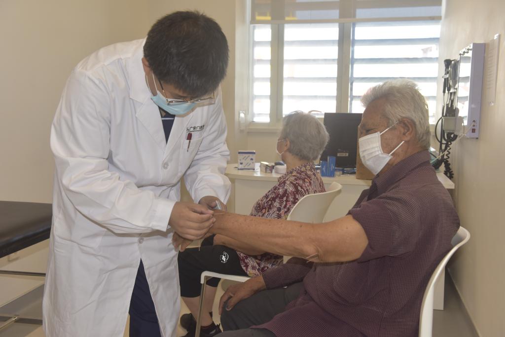 2023年7月28日,甘肃中医药大学针灸推拿专业的土库曼斯坦留学生迪达(右)在老师指导下为患者进行针刺治疗。 新华社记者 陈斌 摄