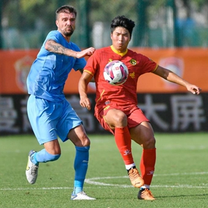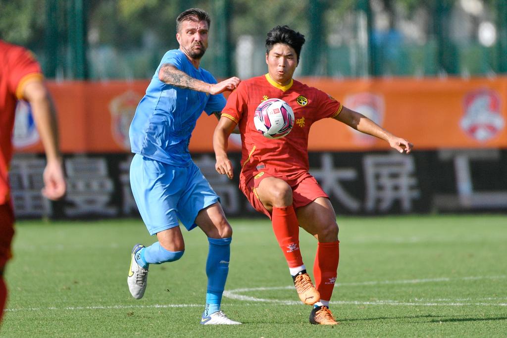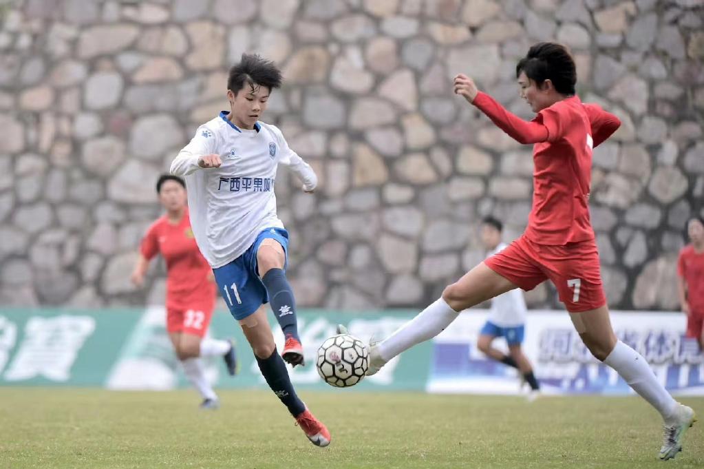 广西平果呗侬女足队员朱慧敏(左)在2023年女甲联赛上与对手拼抢。2023赛季女甲联赛第19轮,广西平果呗侬女足7:1大胜上海求盛东华女足。(平果市足协供图)