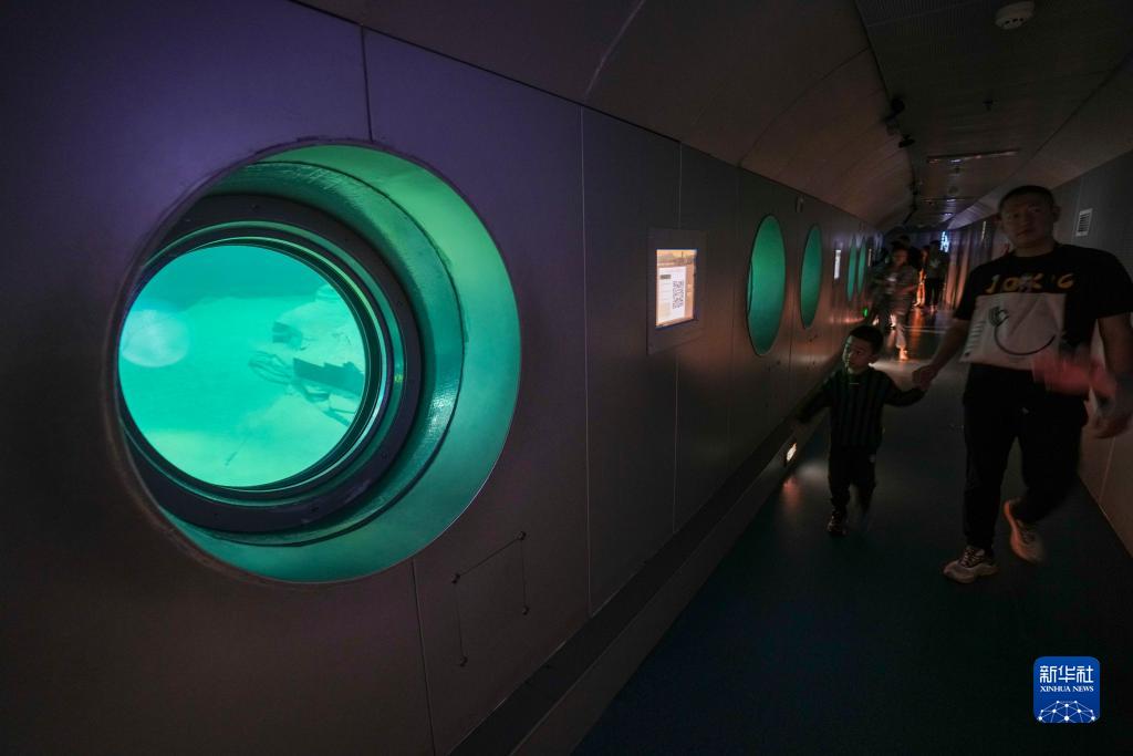 10月13日,游客在重庆涪陵白鹤梁水下博物馆的水下参观廊道内参观。