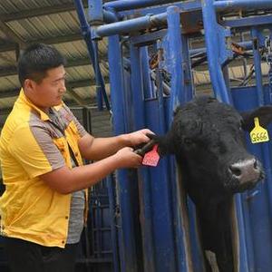 10月13日,河南省柘城县一家肉牛养殖企业的技术人员给牛打上管理耳标。