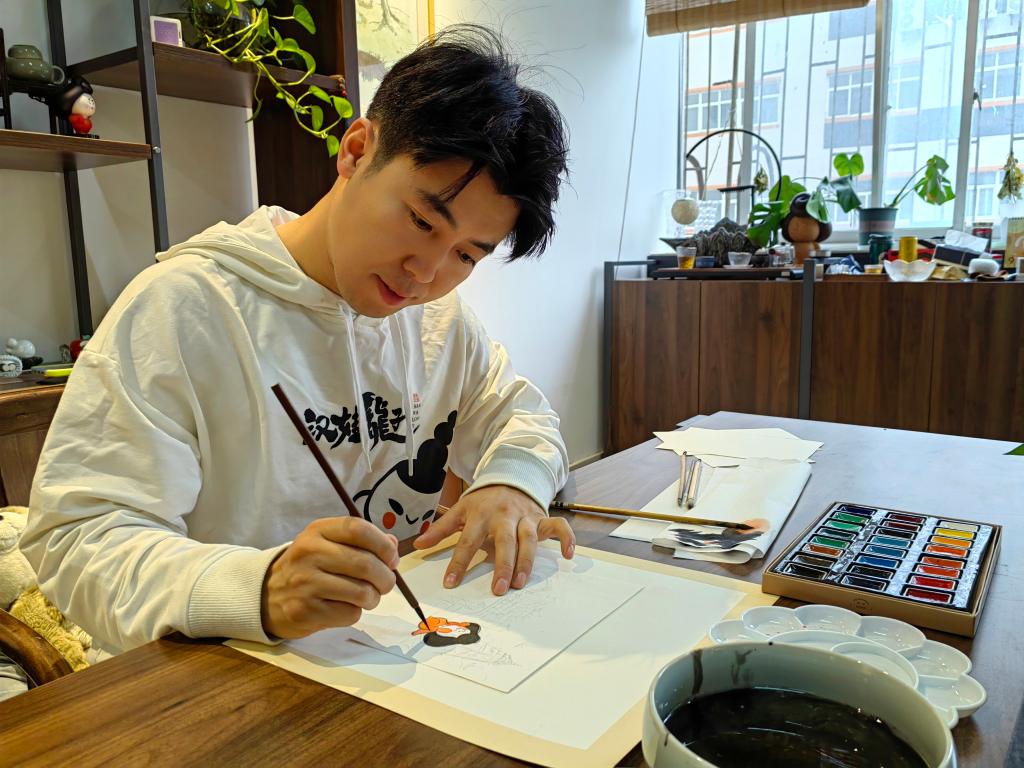 新华社西安10月14日电(记者孙正好)展开扇面,研墨,提笔,在水墨线条的勾勒下,一个微胖还有点“霸道”的唐朝小妞很快跃然纸上。作画者是被诸多文创爱好者唤作“唐妞爸爸”的青年设计师乔乔。
