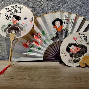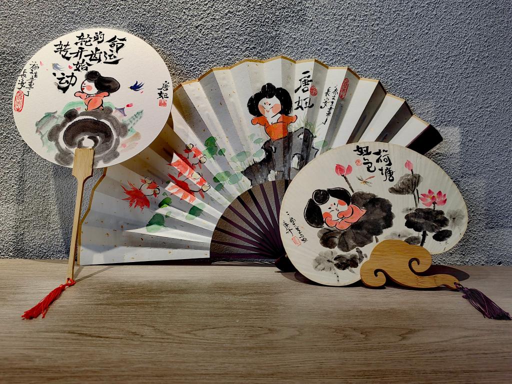 乔乔绘制的唐妞主题折扇、团扇。新华社记者 孙正好 摄