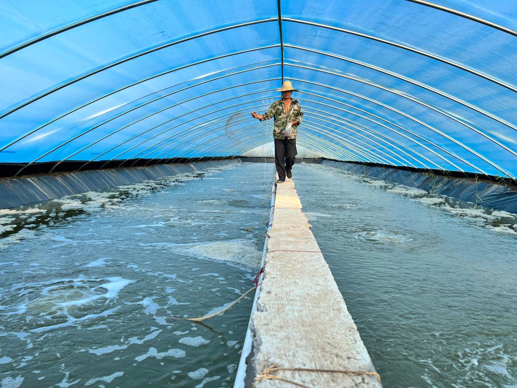 10月10日,在永济市开张镇的养虾棚,养殖员徐冬升正在给小虾喂食。新华社记者 柴婷 摄