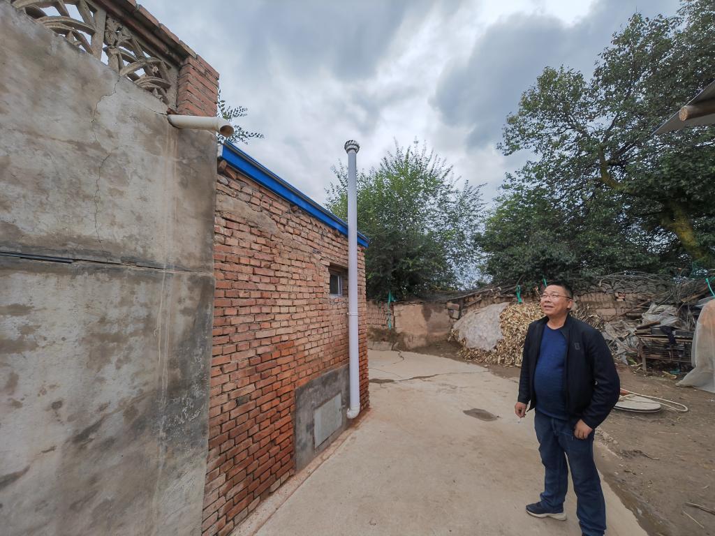 她家厕所是在原有旱厕结构基础上改造的,由红砖砌成,里面贴了防滑瓷砖,外面连着一根超过屋檐的排气管。