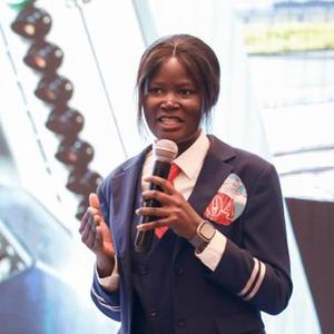 10月13日,在肯尼亚首都内罗毕的演讲比赛现场,来自中国路桥公司的孔奇利亚·奥维尔在演讲。新华社记者 李亚辉 摄