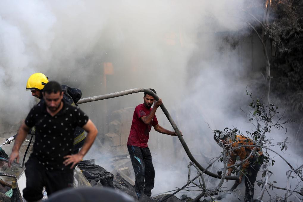 10月14日,在加沙地带南部城市汗尤尼斯,人们在扑灭以色列空袭造成的火灾。新华社发(亚西尔·库迪摄)