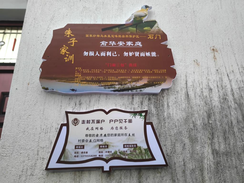 石门村村民俞华安家门口的家训牌。 新华社记者郭强 摄
