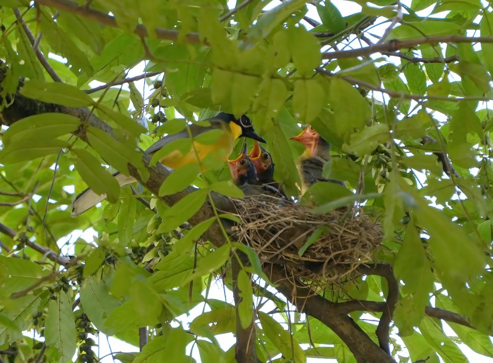 2023年6月28日,石门村内,三只蓝冠噪鹛的幼鸟正在向亲鸟乞食。(胡根旺 摄)