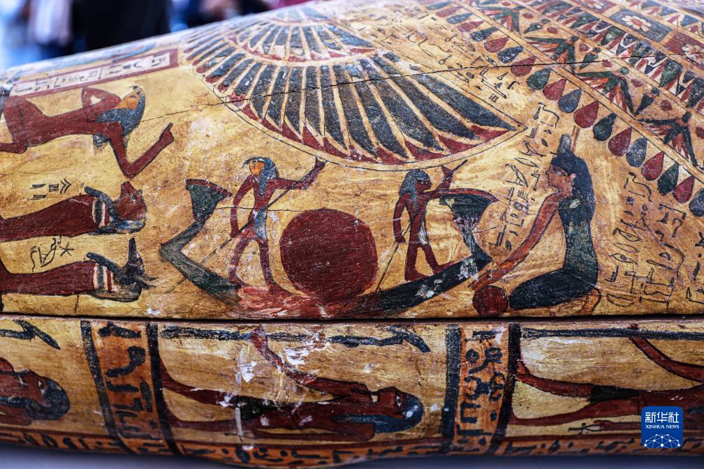 这是10月15日在埃及明亚省考古现场拍摄的彩绘棺椁上的图案。