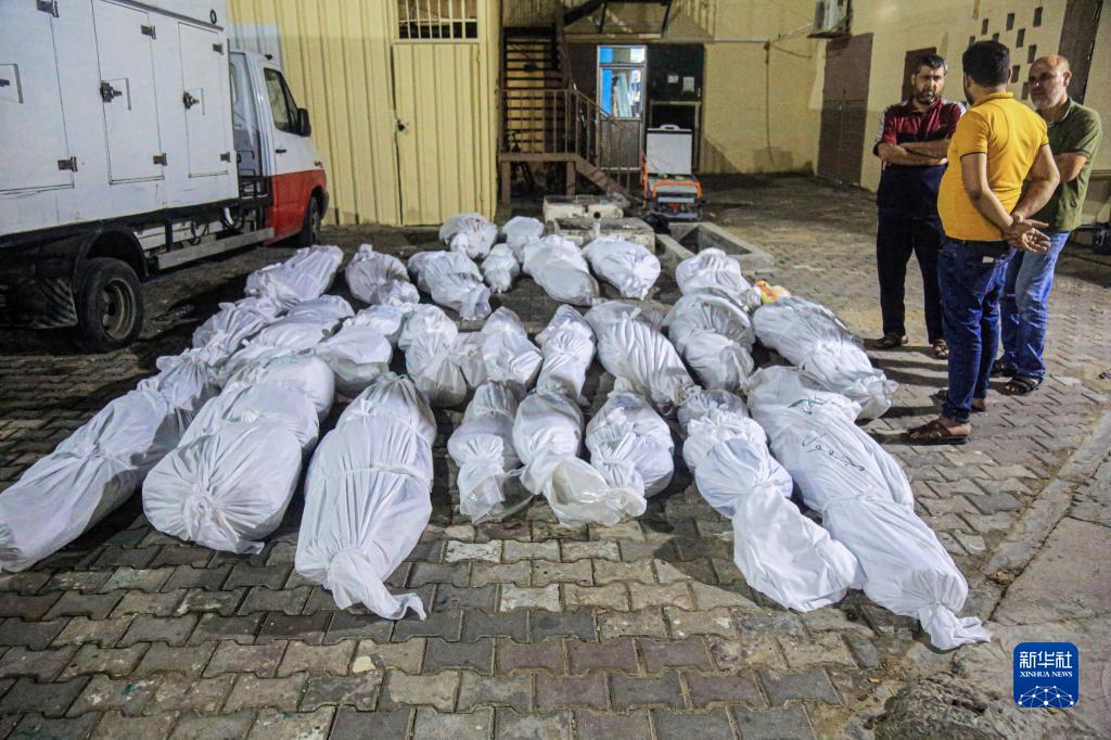 10月15日,在加沙地带中部的代尔拜莱赫,人们站在死去的亲属旁。 新华社发(里泽克·阿卜杜勒贾瓦德 摄)