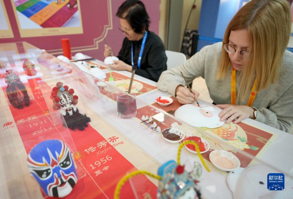 10月16日,在第三届“一带一路”国际合作高峰论坛新闻中心,来自比利时的记者(右)体验画京剧脸谱。