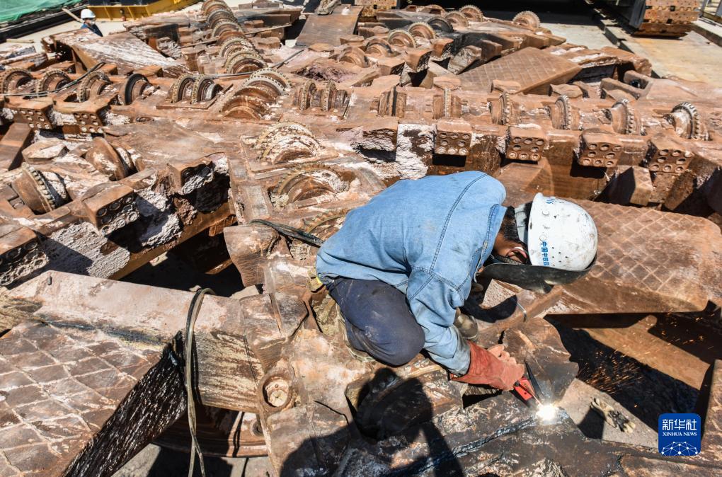 10月16日,施工人员为出洞的“开路先锋1号”盾构机刀盘进行焊接作业。