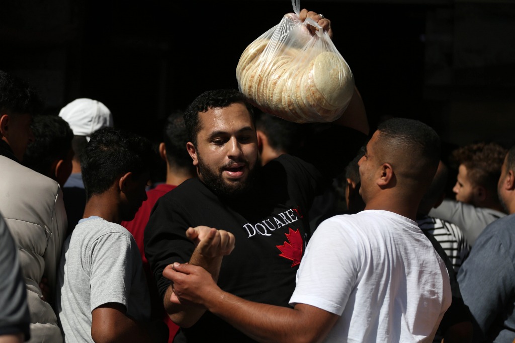 10月15日,在加沙地带南部地区,流离失所者排队购买大饼。新华社发(亚西尔·库迪摄)