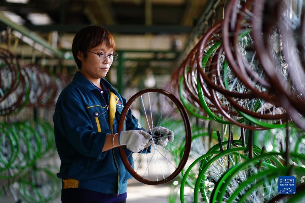 10月16日,平乡县一家童车生产企业的工人在检查童车车圈质量。