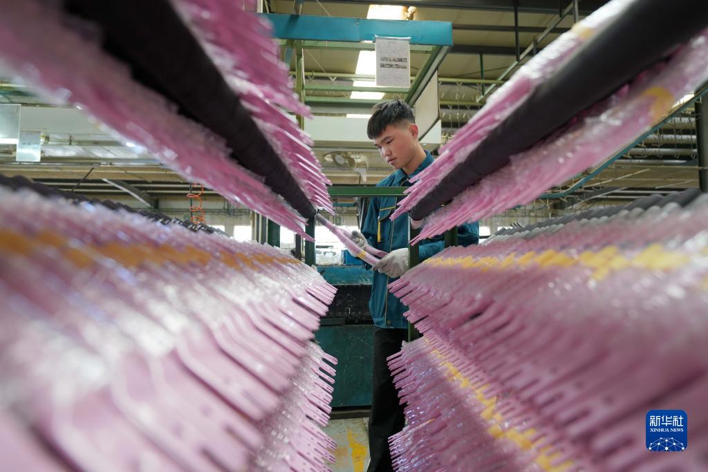 10月16日,平乡县一家童车生产企业的工人在整理童车部件。
