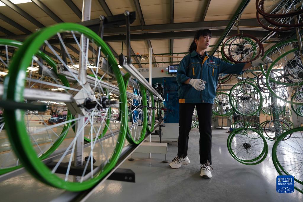 10月16日,平乡县一家童车生产企业的工人在童车车圈生产线上工作。