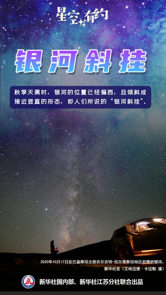 中国科学院紫金山天文台科普主管王科超介绍,人们常用“飞马当空,银河斜挂”来概括秋季星空的特点。整个秋天,人们仍然能看到银河悬挂在天空。不过,银河升起的时间较夏季变早。秋季天黑时,银河的位置已经偏西,且倾斜成接近竖直的形态,即人们所说的“银河斜挂”。