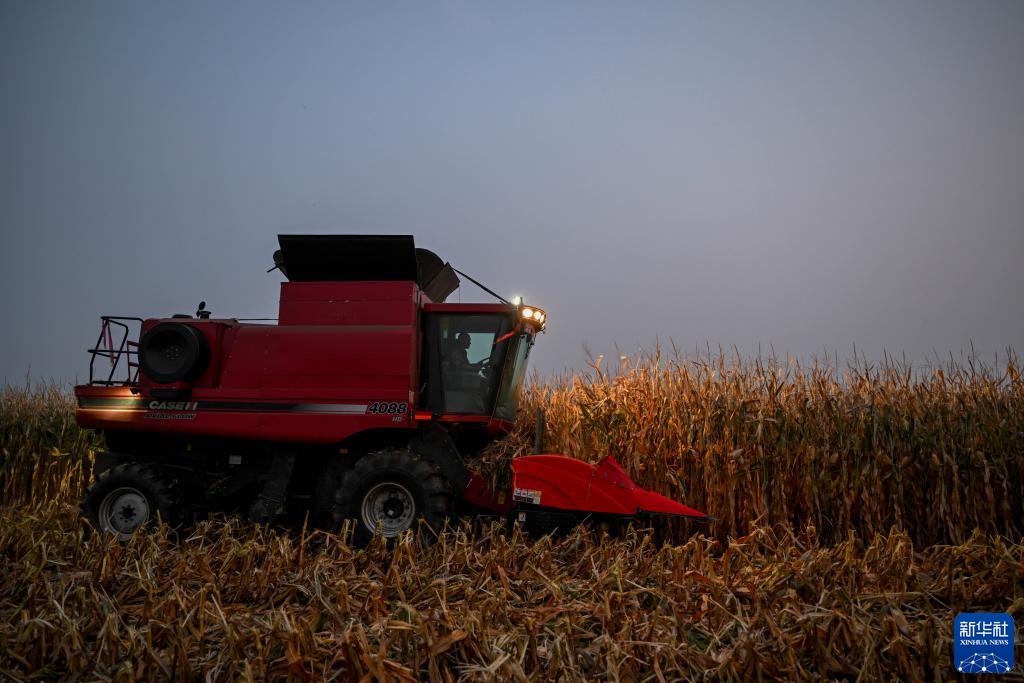 10月13日,农机手在通辽市科尔沁区丰田镇哈拉满罕村驾驶收割机抢收玉米。