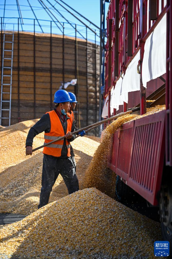 10月15日,通辽市科尔沁左翼中旗腰林毛都镇收粮站的工人在卸粮。