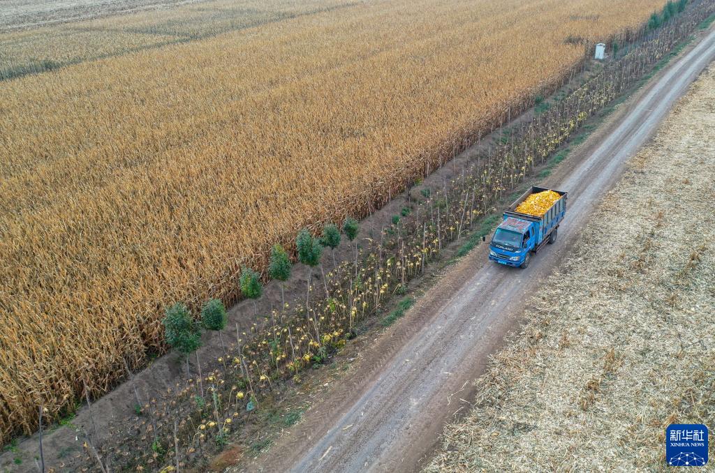 10月13日,通辽市科尔沁区钱家店镇前西艾力村村民驾驶农用车将收获的玉米运回家(无人机照片)。