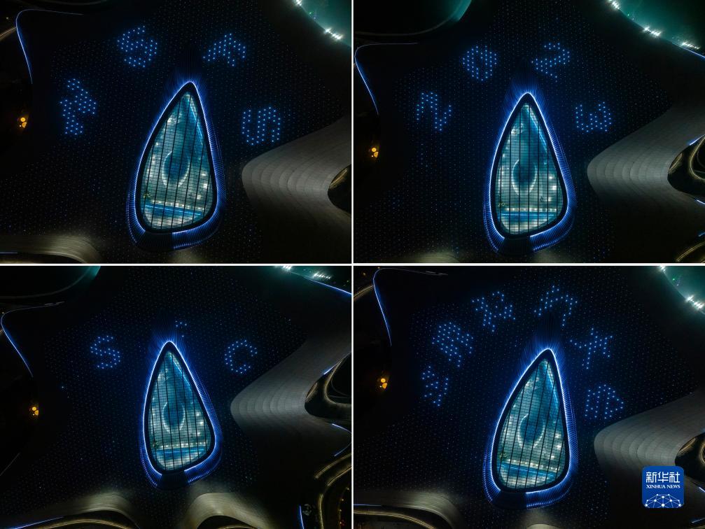 这是10月16日晚拍摄的2023成都世界科幻大会主场馆——成都科幻馆,灯光在其屋顶上打出“WSFS(世界科幻协会)”“2023”“SC(四川)”“世界科幻大会”字样(无人机拼版照片)。