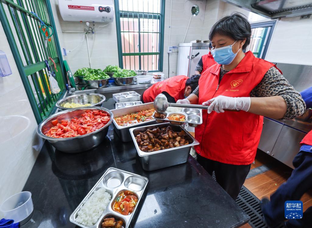 10月17日,志愿者在东白湖镇乐龄中心爱心食堂给老人配餐。