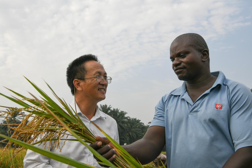 6月20日,在布隆迪布班扎省吉汉加县,中国农业专家组组长杨华德(左)在稻田间和当地农民恩根达库马纳·夏尔交流。新华社记者 韩旭 摄
