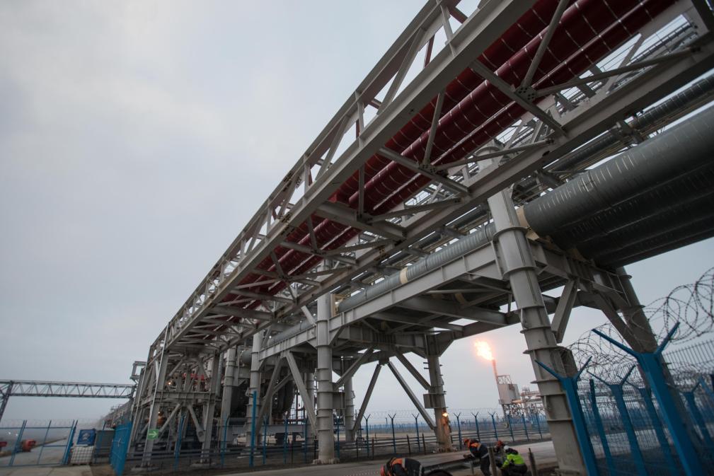 这是2018年8月8日在俄罗斯萨别塔拍摄的中俄亚马尔项目第二条生产线。(新华社记者吴壮摄)