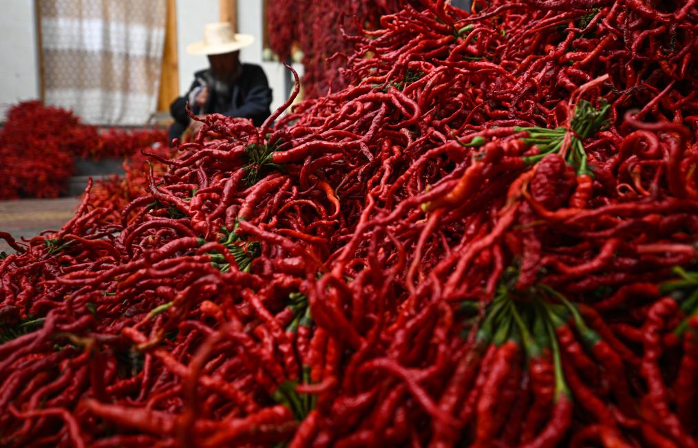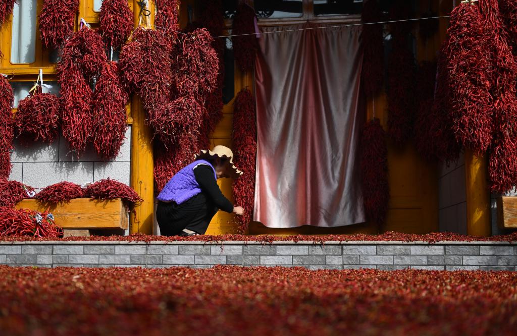 10月12日,在青海省海东市循化撒拉族自治县清水乡田盖村,种植户在晾晒线椒。新华社记者张龙 摄