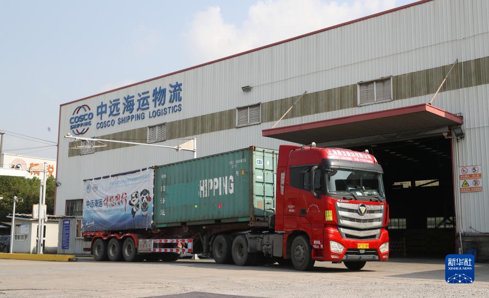10月17日,装载着第六届进博会新西兰及南太平洋地区展品的集装箱卡车驶入上海远洋国际集装箱堆场。