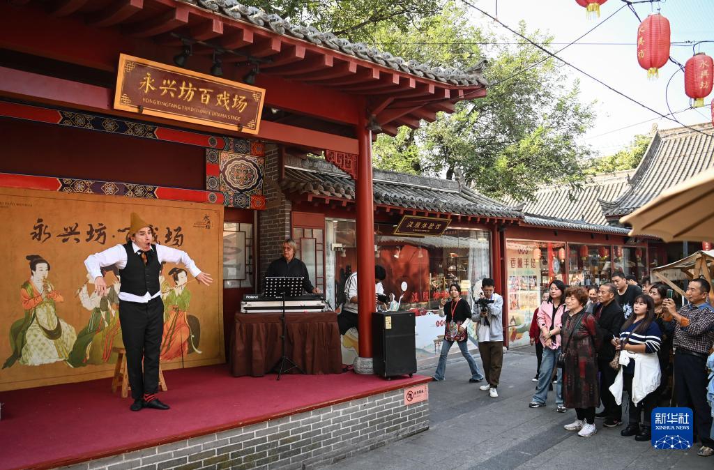 10月16日,来自斯洛伐克法帝西摩剧院的默剧表演艺术家弗拉基米尔·库利塞克(左)在西安永兴坊进行惠民巡演。