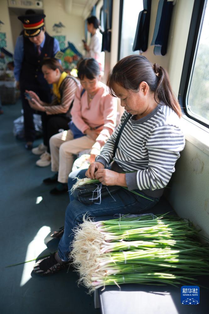 10月17日,沿线村民在5630次列车上整理农产品。