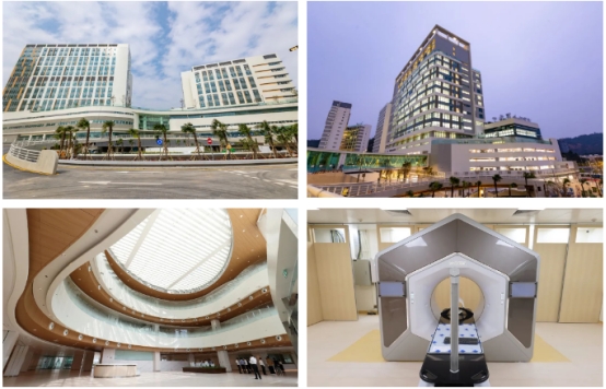 左上:门诊大楼(左)、急诊大楼(右);右上:综合服务行政大楼;左下:综合医院大楼大堂;右下:澳门第一台针对肿瘤放射治疗的AI智能化自适应放疗系统