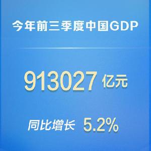 今年前三季度中国国内生产总值(GDP)913027亿元