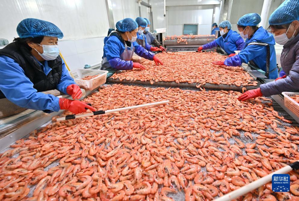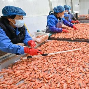 10月17日,工人在河北省唐山市曹妃甸区一家水产加工企业的南美白对虾加工生产线上工作。