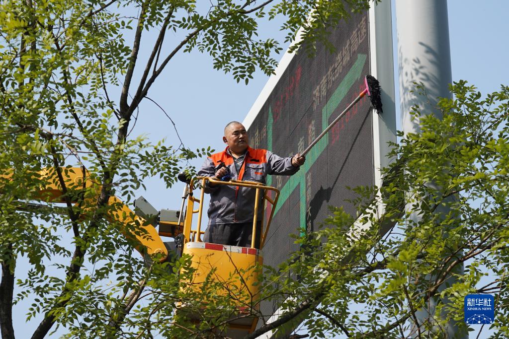 10月17日,保洁人员在清理交通信息牌。
