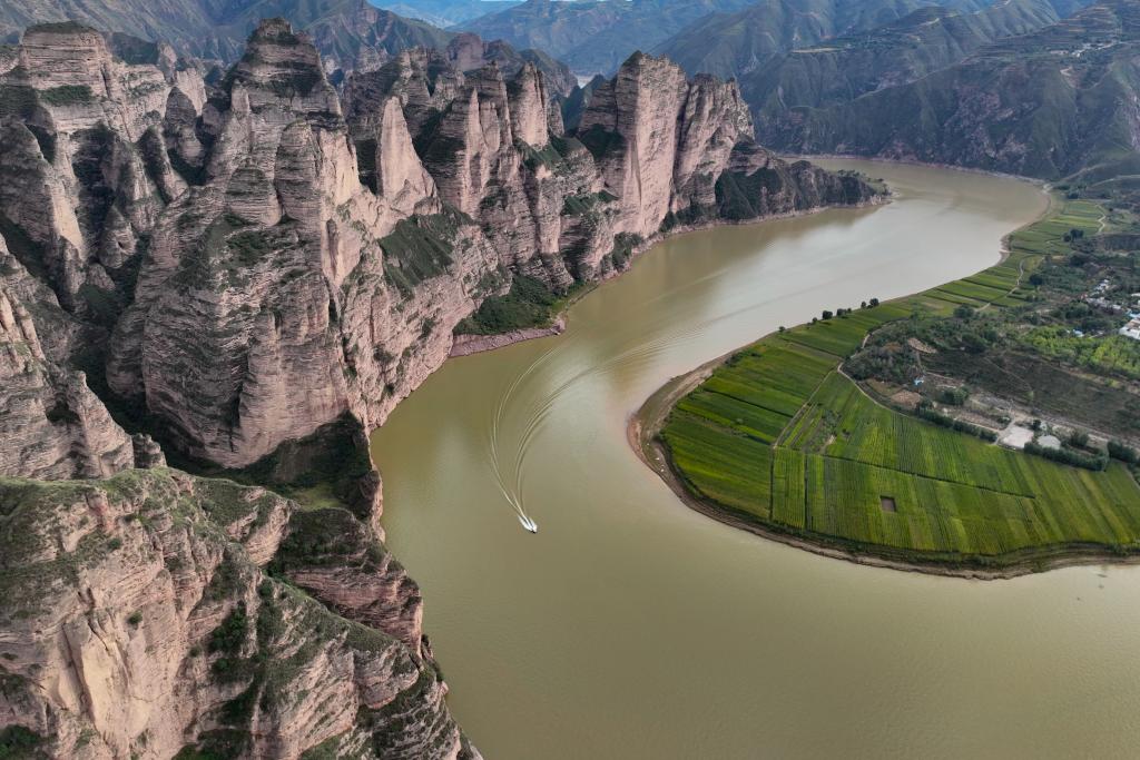 这是9月20日拍摄的炳灵寺石窟周围黄河及石林风光(无人机照片)。新华社记者 郎兵兵 摄