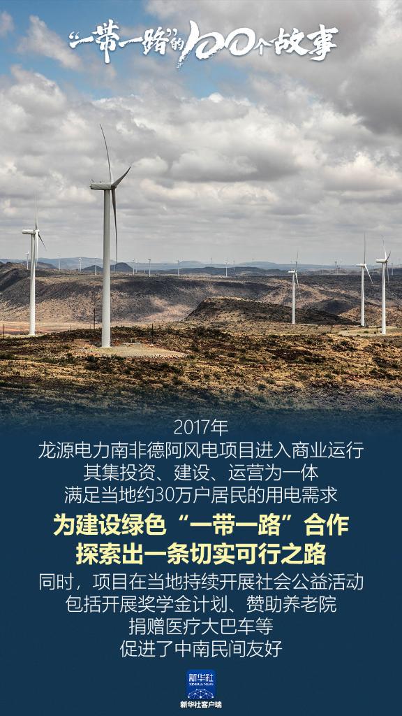 2017 年,龙源电力南非德阿风电项目进入商业运行。其集投资、建设、运营为一体,满足当地约30万户居民的用电需求,为建设绿色“一带一路”合作探索出一条切实可行之路。同时,项目在当地持续开展社会公益活动,包括开展奖学金计划、赞助养老院、捐赠医疗大巴车等,促进了中南民间友好。(记者:王雷、王晓梅)