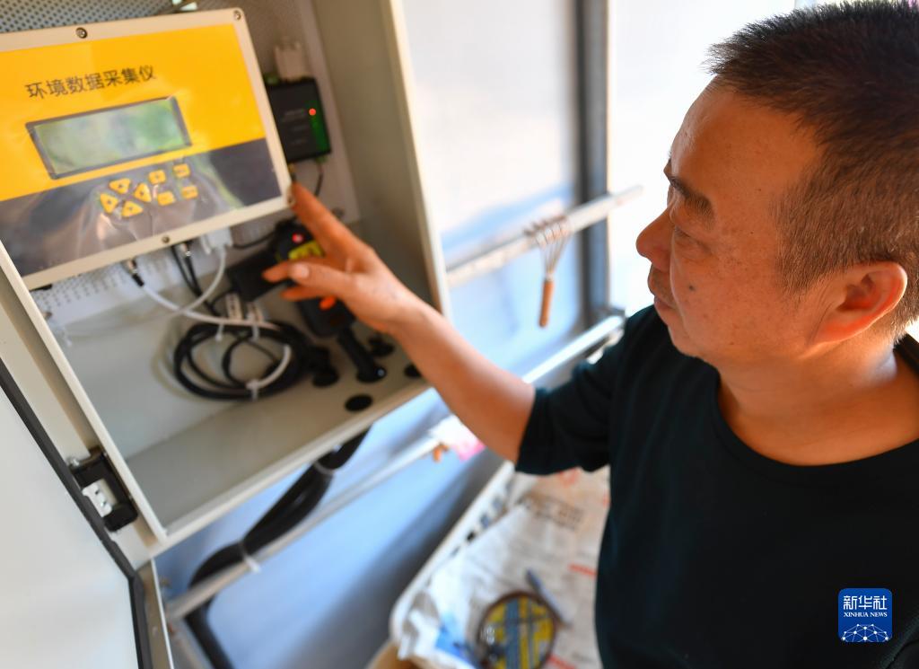 10月18日,在湘潭市雨湖区姜畲镇泉塘子村,技术人员在“5G智慧小菇房”查看环境数据采集仪运行情况。