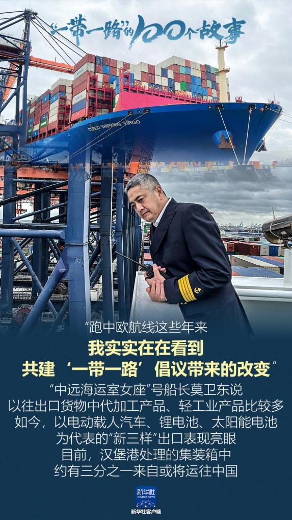“跑中欧航线这些年来,我实实在在看到共建‘一带一路’倡议带来的改变。”“中远海运室女座”号船长莫卫东说,以往出口货物中代加工产品、轻工业产品比较多。如今,以电动载人汽车、锂电池、太阳能电池为代表的“新三样”出口表现亮眼。目前,汉堡港处理的集装箱中,约有三分之一来自或将运往中国。(记者:魏一骏、曹佩弦、檀易晓)