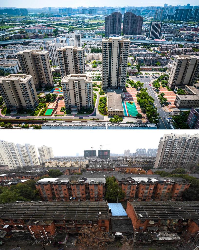 拼版照片:上图为2023年8月3日拍摄的改造后的安徽省合肥市瑶海区安拖东村及新庄城中村改造项目(无人机照片);下图为2015年3月拍摄的改造前的安拖东村及新庄城中村旧貌。 新华社发(解琛 摄)